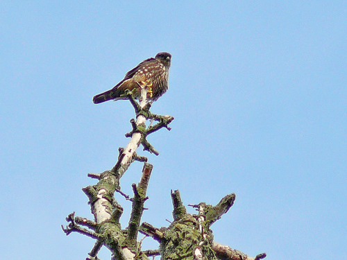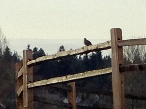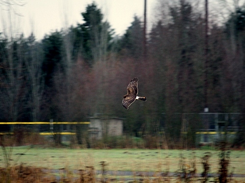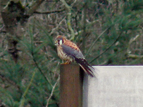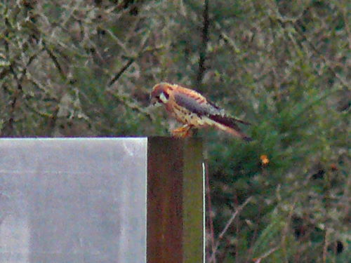 Because the water was high three people walked around and met us. As we walked out of the Alder forest I spotted a RING-NECKED PHEASANT crossing the path down near the large isolated cottonwood. Just around the bend Rachel said they had a flock of PURPLE FINCHES just before the bridge. We missed them. The sparrow piles were completely dead - nobody home. A small flock of CANADA GEESE across from the sparrow piles included two CACKLING GEESE. The AMERICAN KESTREL was back on the soccer goals and put on a show for us.