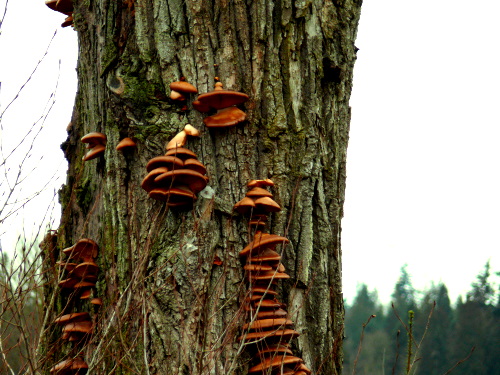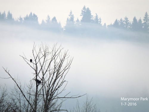 Conditions were really bad, but the light rain early and the dark grey conditions kept the birds quiet. Most birds showed up in ones and twos, with just a few flocks. One nice flock of GOLDEN-CROWNED SPARROWS, FOX SPARROWS, SONG SPARROWS near the first water access, a nice WILSON'S SNIPE flew from the edge before we reached the weir and circled back and landed on the edge about 30 feet away. Several flocks of DOUBLE-CRESTED CORMORANTS flew over, probably about 30 in all. A nice mixed flock of BUSHTITS, kinglets and chickadees were way up in the tops of the cottonwoods before Dog Central - too high under low light conditions to make reliable identification possible. They followed us down the path until just before leaving the dog area. We wondered if we were going to miss DOWNY WOODPECKER, but one showed up just before the gate to the cottonwood forest.