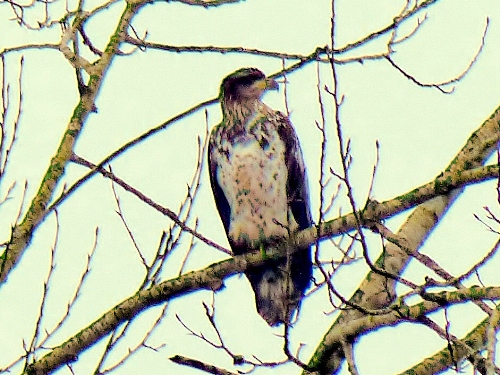 When I went to bed Wednesday night, the weather forecast looked like God’s warning to Noah. Near 100% chance of rain every hour forever. So I was pleasantly surprised when the rain stopped before sunrise, and didn’t pick up again until nearly 11:00 a.m. ! Very fortuitous. The morning was dark and breezy though, and Bald Eagles (and dogs in the slough) were making life difficult for ducks below the weir. Long stretches of the morning had no birds seen or heard. We did have a few good birds, though.