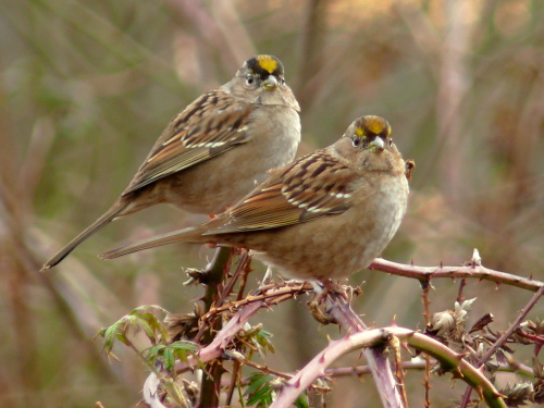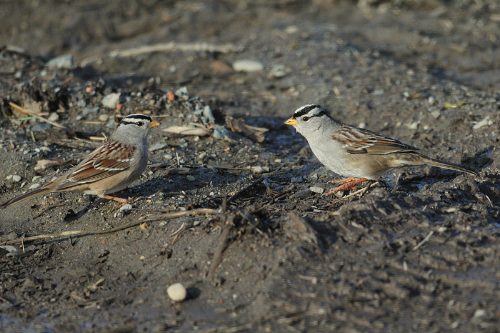 Two adult White-crowned Sparrows, apparently of the gambelli subspecies.