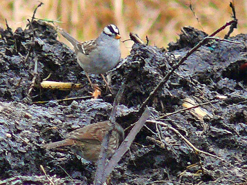 Adult White-crowned Sparrow with Song Sparrow. Photo by Ollie Oliver