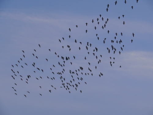 It took us forever to get out of the parking lot, since we were awed by the large flocks of (mostly) Cackling Geese that were flying in to the grass soccer fields. Amazing scene. We managed to pick out the two GREATER WHITE-FRONTED GEESE among them; the white-fronts were not together. The geese were all still there at noon when we passed through again.