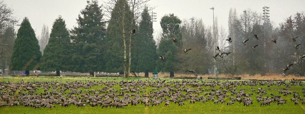 Less than a third of the Cackling Geese that landed on the grass soccer fields. Photo by Ollie Oliver |