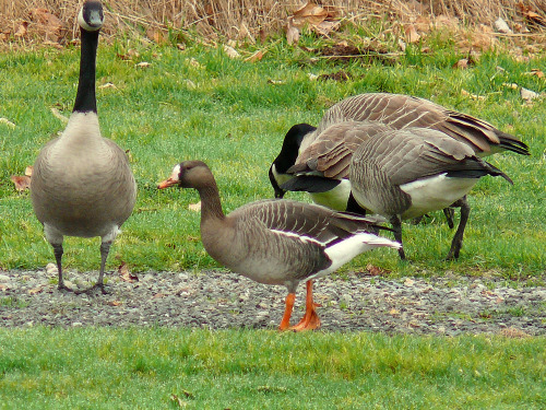 A large flock of CACKLING and CANADA GEESE on the grass soccer fields also contained one SNOW GOOSE and one GREATER WHITE-FRONTED GOOSE.
