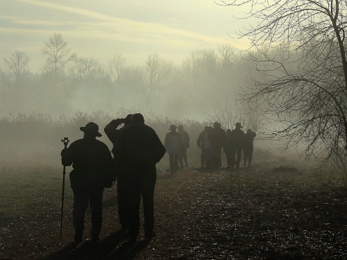 What a difference a week makes. Instead of me solo, there were ten of us today. And the weather was remarkably, notably, delightful with temps 43-50 degrees, no fog, little wind, and no precipitation after dawn; fabulous compared with the dismal weather on the 18th. It was birdy for a while too, though after the first 1.5 hours, it got notably quiet.