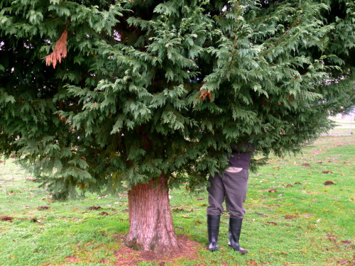 Matt looks for owls in a cedar |