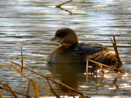 When we were at the lake platform we were looking into the sun. So after the walk, I went to the cabana at the condo place where I've gotten permission for the occasional visit, so that I could see what we couldn't see before. Sure enough, there were several HORNED GREBE, which we thought we might have seen earlier. Also there, though, were a half-dozen RUDDY DUCK - a very nice bird to see.