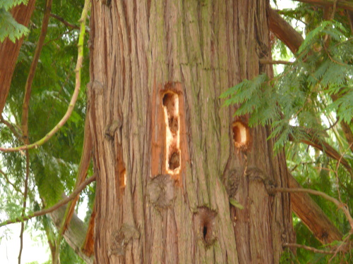 Fresh workings by a Pileated Woodpecker in a Western Red Cedar near the mansion