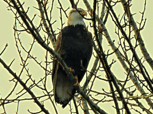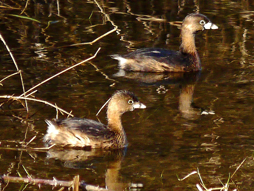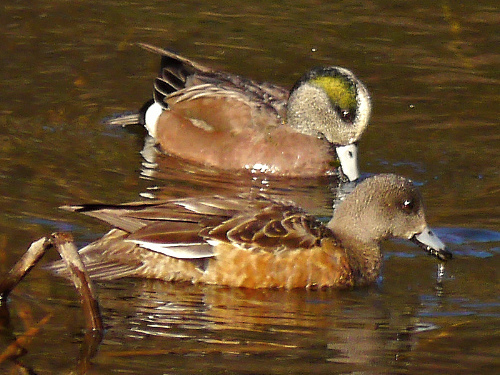 The pair of BALD EAGLES was near the new nest, and the female (based on size) was eating a coot draped over the branch of a cottonwood quite close to the trail. The little feet dangling down made ID of the prey easy. Later, when we got to the lake, we watched an adult Bald Eagle hovering and making swipes at a tight ball of AMERICAN COOTS. The coots mostly just flapped their wings, but otherwise remained motionless. They didn't dive and they mostly didn't try to flee. Apparently the mass of wing flapping is an effective defense.