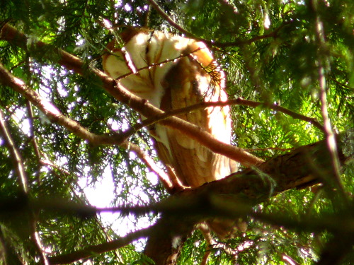 Barn Owl being warmed by the sun, in a cedar near the windmill