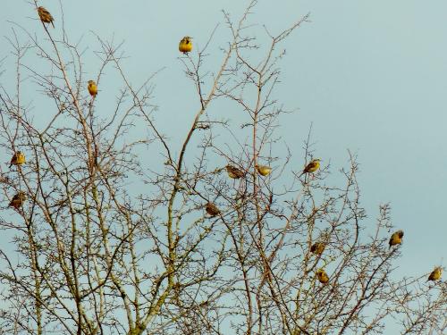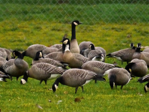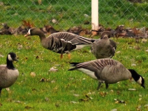 As I was driving home, I saw a flock of geese looking like they would land in the NW corner of the park, so I made a quick right turn back into the park. Sure enough, I found a flock of CACKLING GEESE on the grass softball fields west of the tennis courts. Among them was an adult GREATER WHITE-FRONTED GOOSE – (FOY). While I was viewing them, I heard a call, turned around, and found six AMERICAN GOLDFINCH in a tree in the parking lot. So that quick stop yielded 3 new birds for the day .