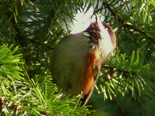 We had birds making weird sounds - a robin making repetative noises a la a mockingbird, and a Song Sparrow making strange noises I'd never heard before.