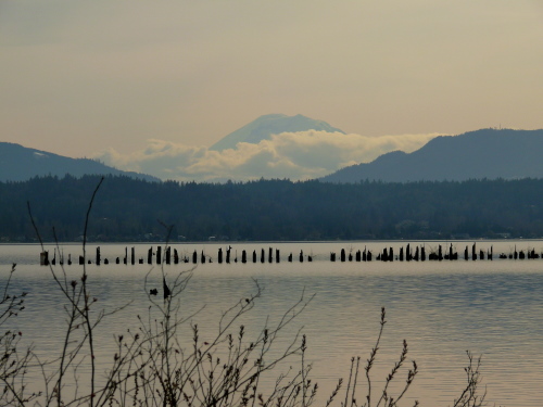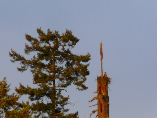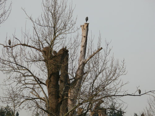 Lots of singing birds, including Black-capped Chickadee, Brown Creeper, Bewick's Wren, Spotted Towhee, Fox Sparrow, Song Sparrow, Dark-eyed Junco, House Finch, and Purple Finch. Mallards were copulating. A Red-tailed Hawk was atop the odd snag nest for a while.