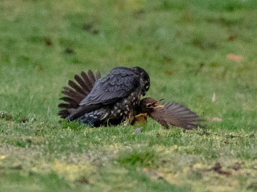 Merlin just about to take off with dead American Robin. Photo by Tony Ernst