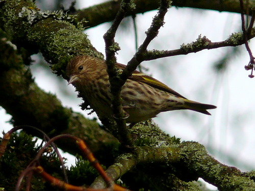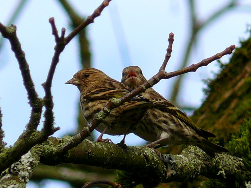 More Pine Siskins, engaged in some ritual pair feeding exercise, I think.