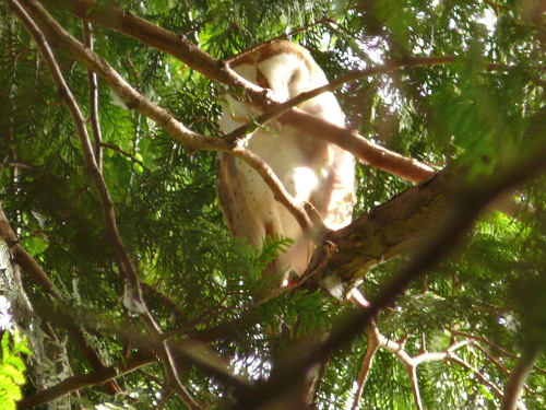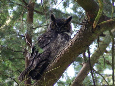 Ollie had seen 2 GREAT HORNED OWLS near the mansion on Monday morning, so we were actively looking when we started walking through the Doug Firs northeast of the mansion. Owls nested there 2 years ago. Matt very quickly found a GHOW, but we could not find more than one.