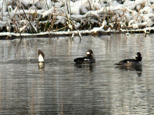 There were bunches of COMMON GOLDNEYE - probably 10 in the slough and 10 at the lake. Couldn't find a Barrow's amongst them, unfortunately.