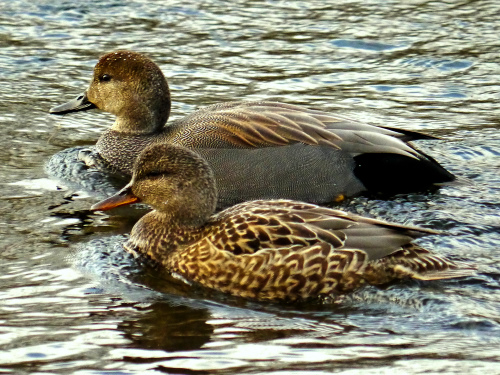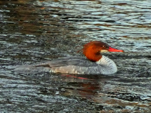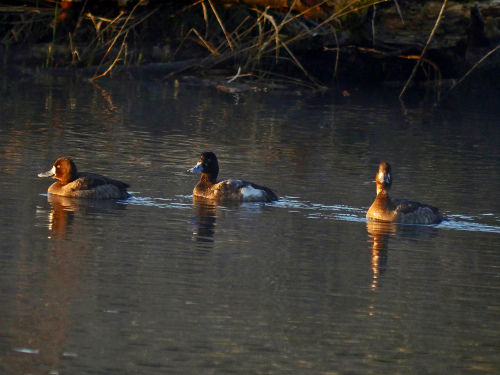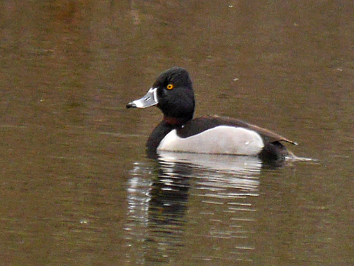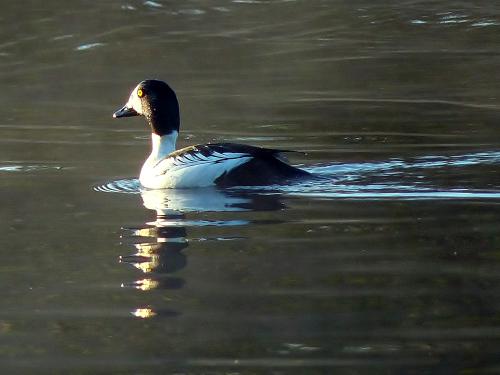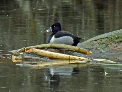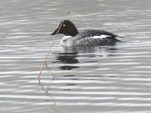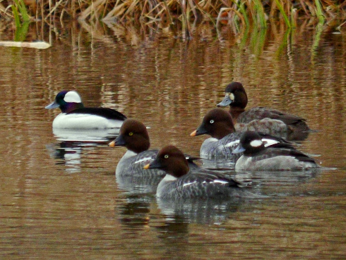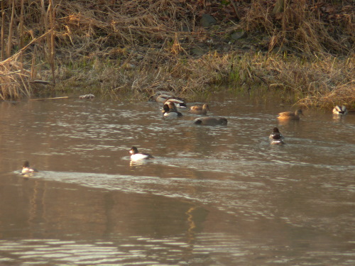 Common Goldeneye, a male Ring-necked Duck, Gadwall, and Mallard at the weir