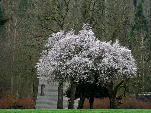 Fifteen of us waded through fog out to the lake, but then the fog cleared. It was an interesting day, with most of the best birding coming later in the morning. Signs of spring everywhere, from the birds singing to the birds fighting to the first Oso Berry blossoms (Indian Plum) of the year. One of the ornamental fruit trees near the mansion was also beginning to bloom.