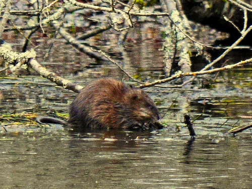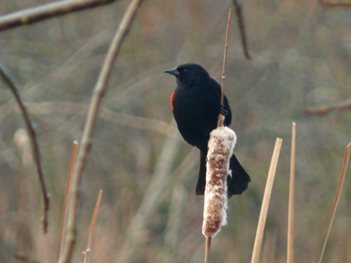 We puzzled for a long time over a cricket-like chirping sound below the weir. Remarkably, this quiet noise was being made by a RED-WINGED BLACKBIRD who would occasionally shift to the usual Okaleee call.