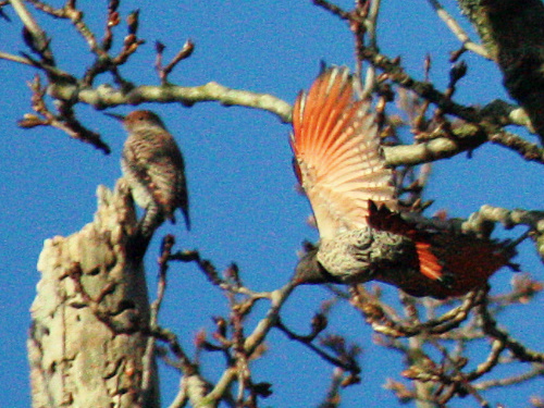 We had a 5 WOODPECKER DAY, with a PILEATED flying south early, a HAIRY WOODPECKER south of Dog Central, a DOWNY at the south end of the Dog Area, a NORTHERN FLICKER at a possible nest hole near the park office (and a group of 5-8 more at the Rowing Club), and a RED-BREASTED SAPSUCKER near the park office.