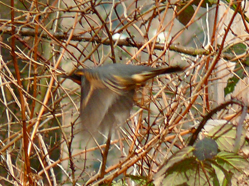 Ollie's flight photo shows the distinctive longitudinal wing stripe of this species, which can be used to distinguish Varied Thrush from American Robin in flight. It is an unusual field mark among passerines, but Townsend's Solitaires and Pine Siskin are also noted for their wing stripes |