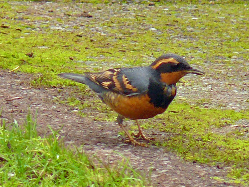 Varied Thrush male next to Clise Mansion amongst dozens of American Robins