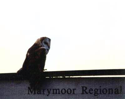 Young Barn Owl perched atop the old sign at the entrance to the off-leash dog area, May 23, 2001 |