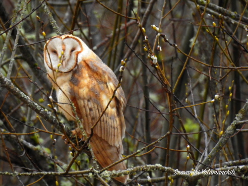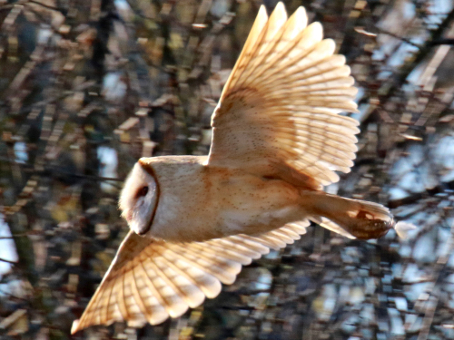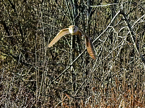 But almost every morning, in all seasons, we see Barn Owls. They look like huge, long-winged moths, ghostly pale in the dim light, as they fly with steady wing-beats low over the meadows. They work the edges of the willows, and follow the lines of ditches, and crisscross the grasses, suddenly whirling to the ground to snatch at a vole or a mouse. They usually come up from the ground with empty talons, but quite often we’ve seen them fly into the willows clutching a last furry meal before their day’s rest.