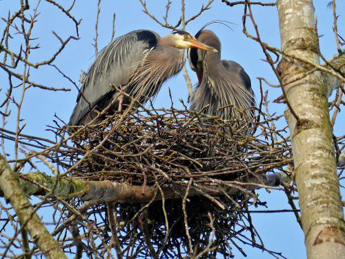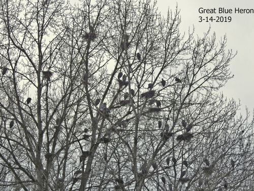 The Great Blue Heronry is getting very active, with herons sitting down in many of the nests, lots of nest building observed, and one copulation observed as well.