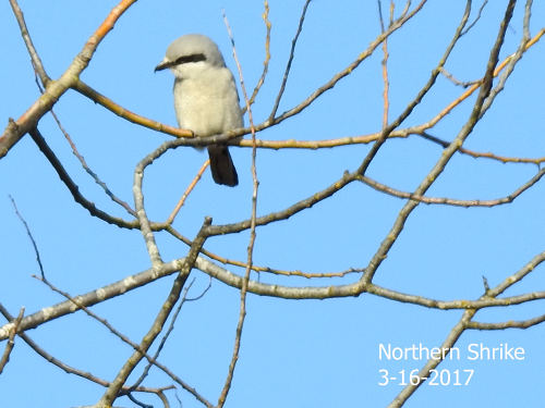 I was not able to get close enough to the shrike to rule out Loggerhead; we've seen Loggerhead Shrike 3 years previously during this week of the year, accounting for 15% of shrike sightings during Week 11. That's a high enough ratio that I won't just assume this was a Northern Shrike. That said, most of our LOSH sightings (in fact, all our other sightings) have been in April.