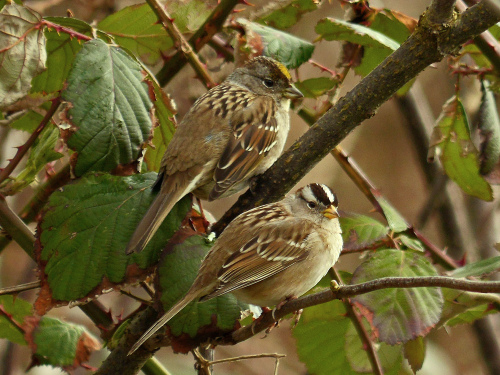 White-crowned Sparrow with Golden-crowned Sparrow. Photo by Ollie Oliver