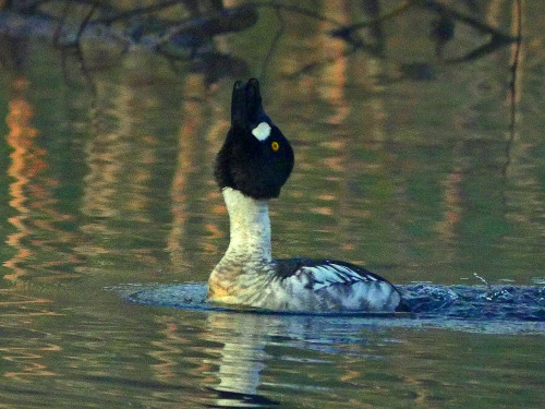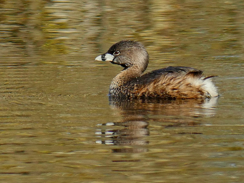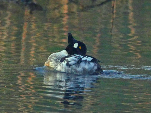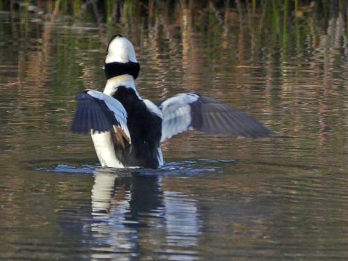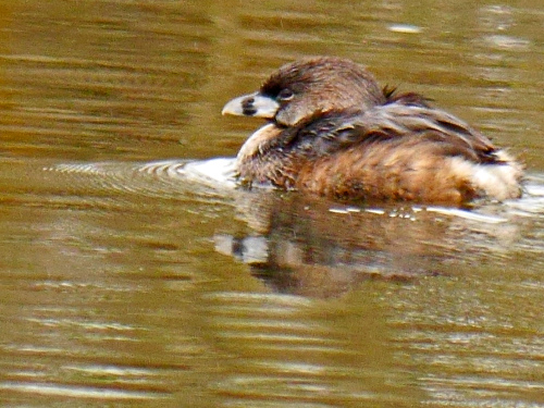 When we were at the lake, Sharon thought she'd seen a HORNED GREBE. It disappeared before we could verify. So at the end of our walk, I visited the cabana for another look. While there, I had great looks at a pair of HOODED MERGANSER, as well as three COMMON MERGANSER. And, with my scope, I was able to find a HORNED GREBE about half-way into breeding plumage. It would have been visible from the lake platform, but would probably have required a scope for ID.
