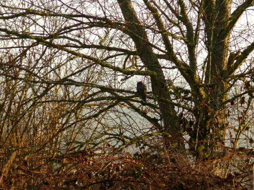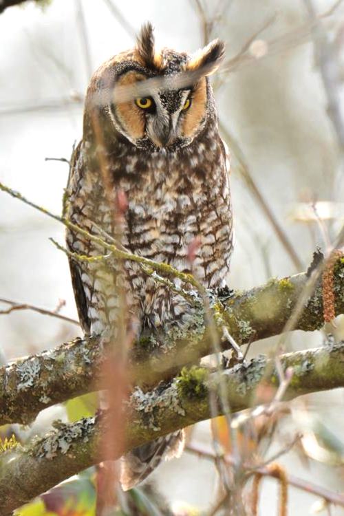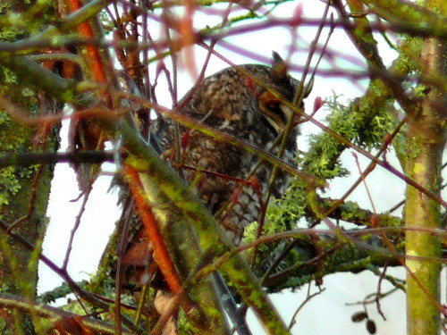 The LONG-EARED OWL, which we originally identified as a Great Horned Owl, spent the entire morning low in a Red Alder a bit east northeast of the weir. See the blog for photos.