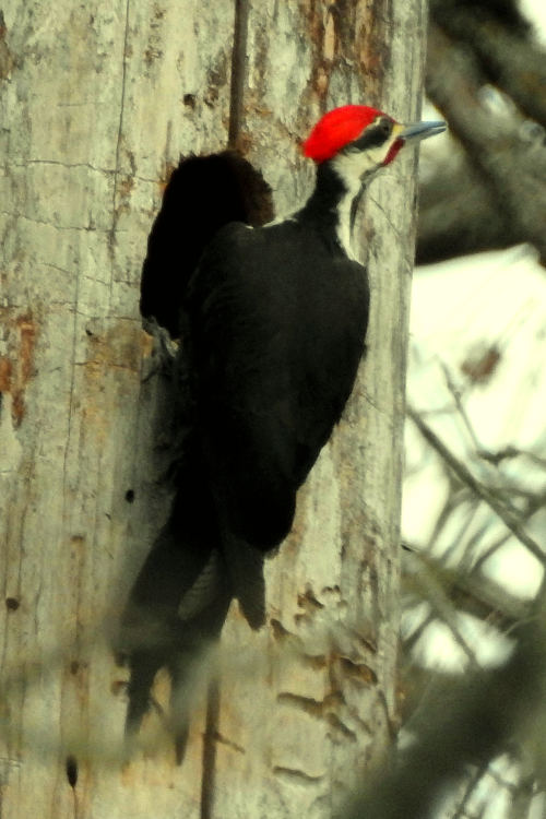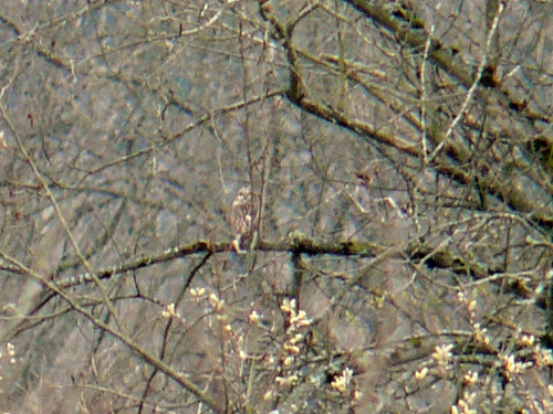 Perched 100 ft east of the weir, low in a tree, all morning. Puffed out in the cold, looking more like a Great Horned Owl by shape. |