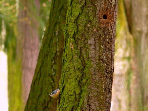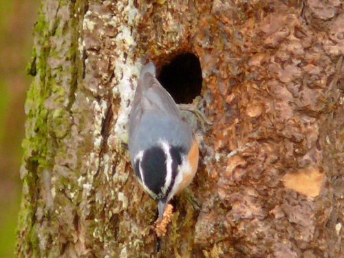 Male Red-breasted Nuthatch frozen against the trunk of the tree. Nest hole above.