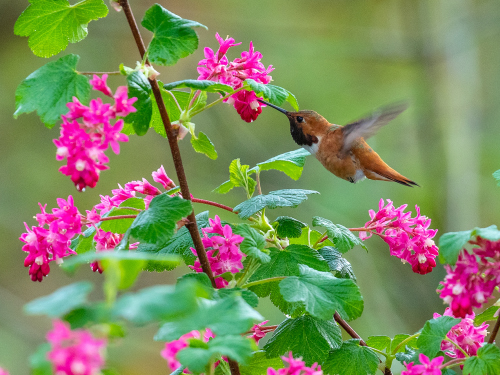 Male Rufous Hummingbird feeding on Red Flowering Currant. Photo by Tony Ernst