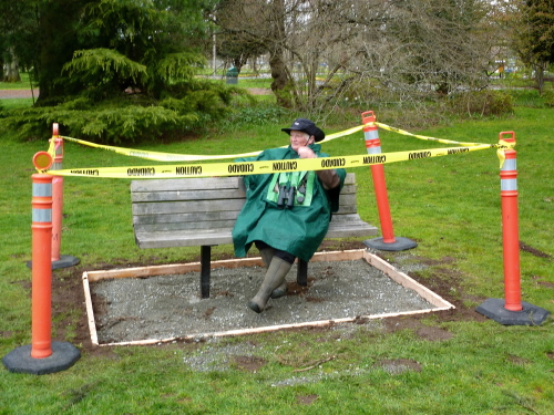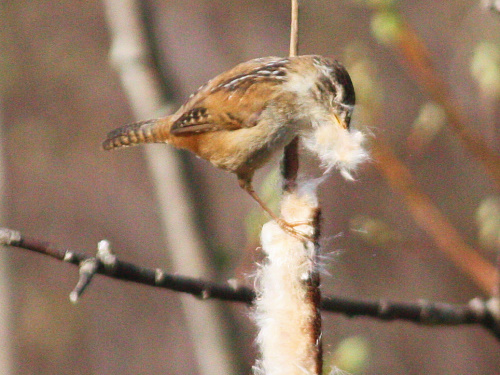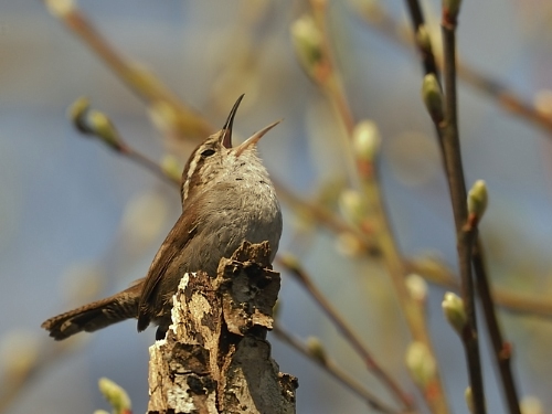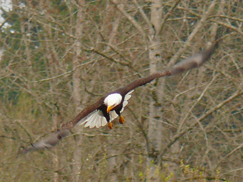 GREAT BLUE HERONS continue to sit on, and enhance, their nests. A BALD EAGLE was in the nest south of the model airplane field. A CHESTNUT-BACKED CHICKADEE brought nest materials into a box in the Pea Patch. TREE SWALLOWS were laying claim to other boxes. We found two BUSHTIT nests, one being built, the other looking finished. We saw a BROWN CREEPER disappear into a nest in peeled bark on a snag. At least 20 species were heard singing today, along with DOWNY and FLICKER drumming, and ANNA'S and RUFOUS HUMMINGBIRDS displaying.