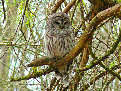 BARRED OWL, in the big Weeping Willow, along the Rowing Club path