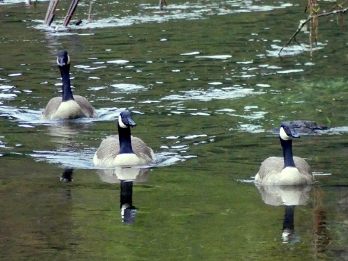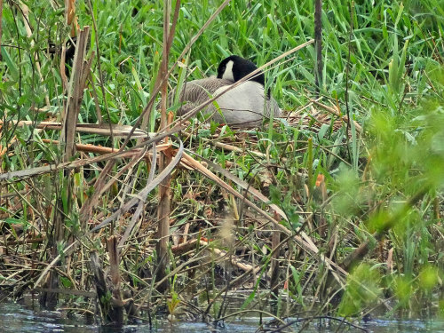 CANADA GEESE remain nesting on both Osprey platforms, despite the presence of at least three OSPREY. The Ospreys appear to be trying to start a new nest on a different light pole in the NE ballfields, having (we heard from another birder) tried and failed to dislodge the geese earlier in the week.