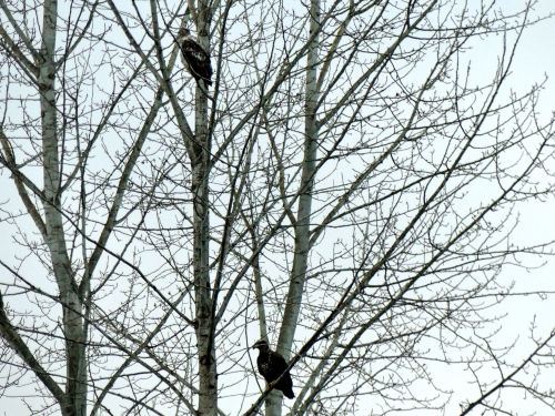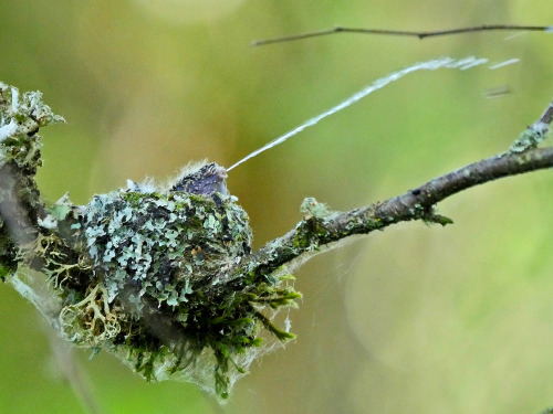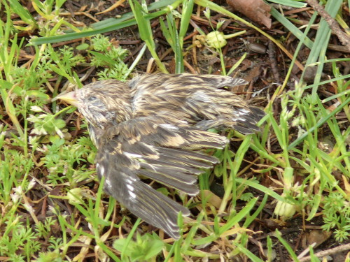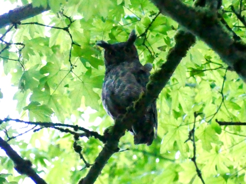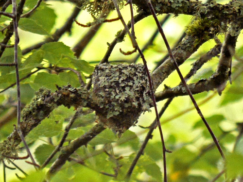 The RED-TAILED HAWK nest atop the odd snag was empty all day. Possibly their nest failed with the recent atrocious weather. We also found a dead fledgling PINE SISKIN near the stage, and a hundred yards away on the lawn we found what could have been a 2-day-old robin dead. We also found a BUSHTIT nest with the bottom missing. Tough time for nesting...
