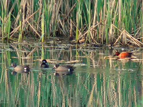 Two male Blue-winged Teal, a male Cinnamon Teal, and a female Bufflehead, all together above the weir. Photo by Ollie Oliver.