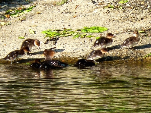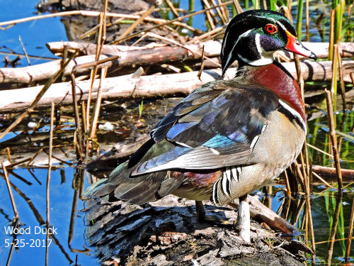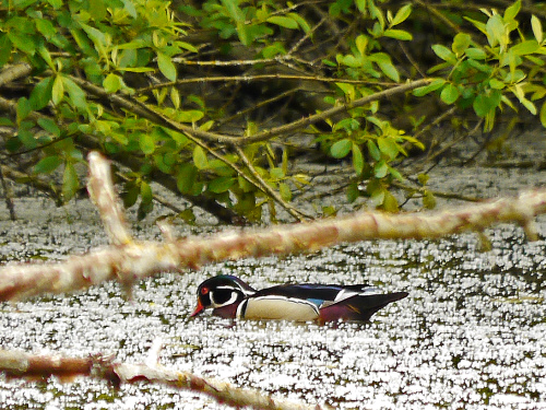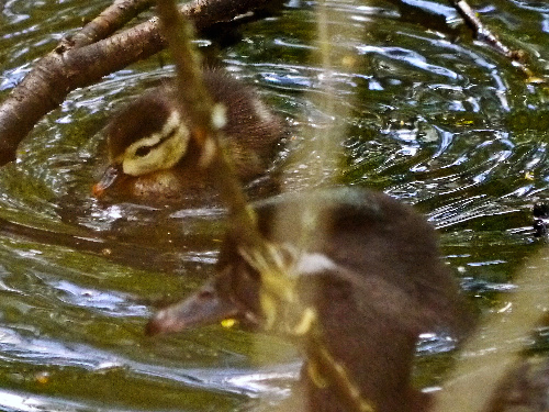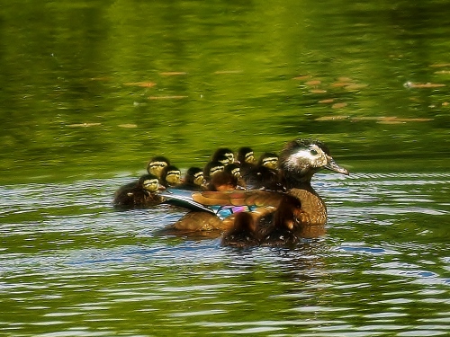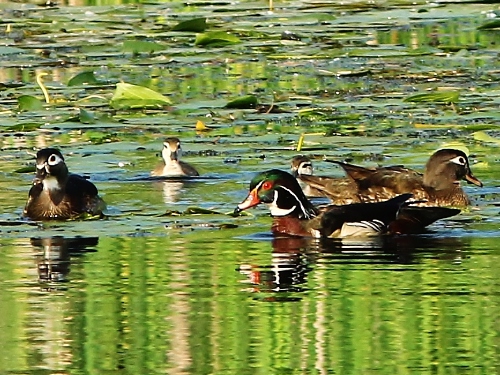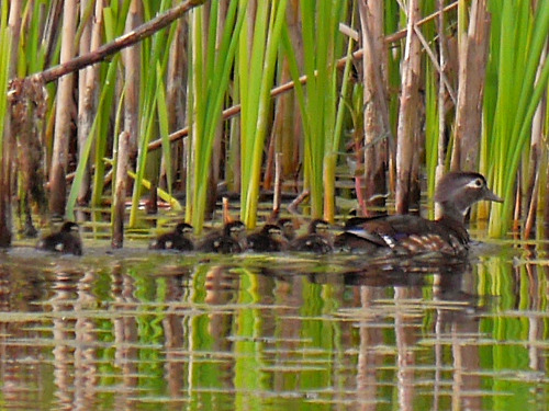 - Wood Duck – Four adult males, two adult females, and 10 small ducklings at the Rowing Club