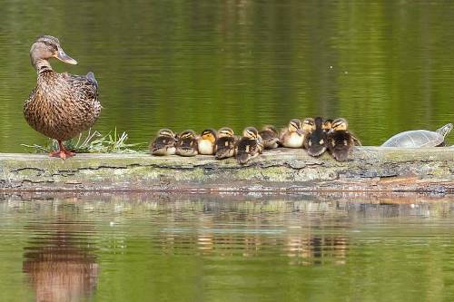 Female Mallard, with her ducklings and a turtle.