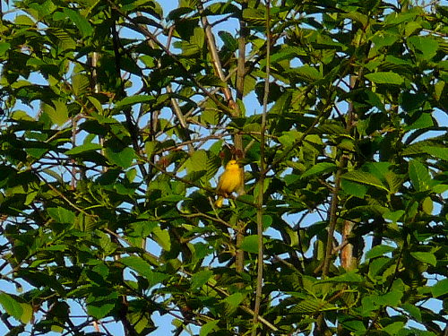 Male Yellow Warbler singing from the far side of the slough