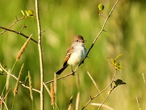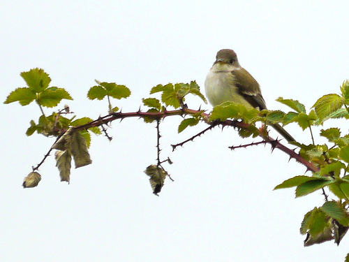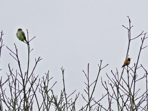 Willow Flycatcher and a male Rufous Hummingbird sharing a bush in the Dog Meadow.