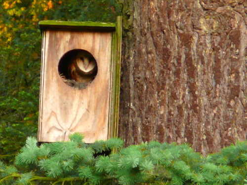 The BARN OWL in the nest box is rising higher and higher in the box, and is looking cramped. We couldn't see any young ones yet, though.