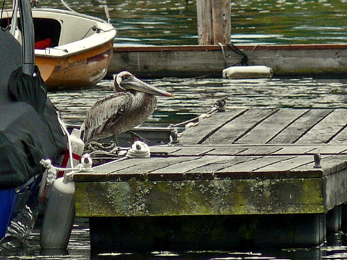 This Brown Pelican spent a day on a dock along the northwest shore of Lake Sammamish, on a spot visible from the Marymoor lake platform.