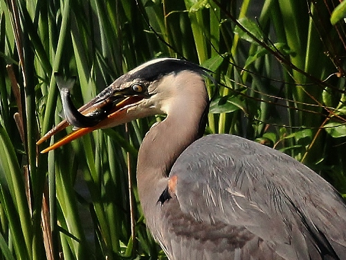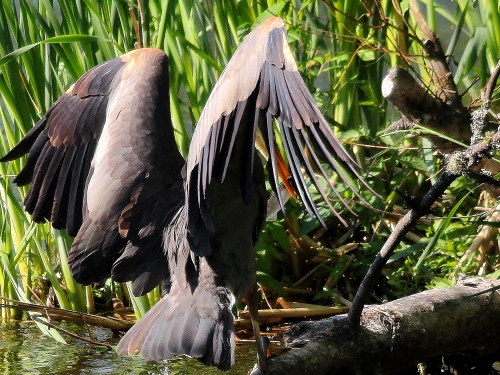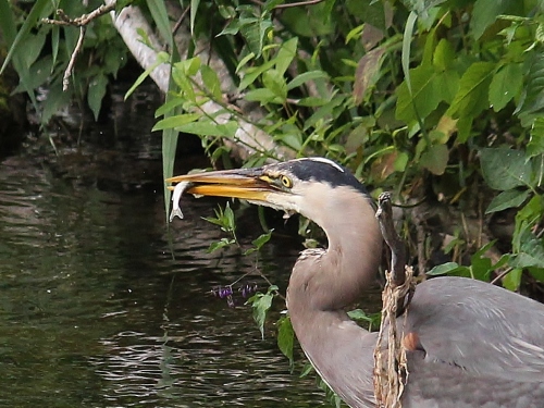 For juveniles, we had lots of baby AMERICAN ROBIN, a female RED-WINGED BLACKBIRD feeding a young bird below the weir, a probable juvenile RUFOUS HUMMINGBIRD near the start of the boardwalk, at least one baby GREEN HERON visible under the adult on the nest at the Rowing Club, and a baby HAIRY WOODPECKER was peeking out of the nest hole across from the Rowing Club dock.
