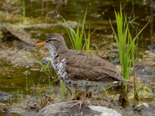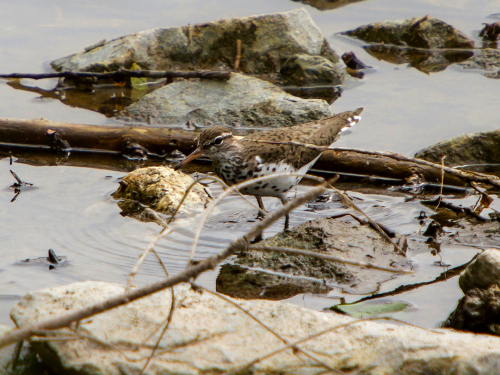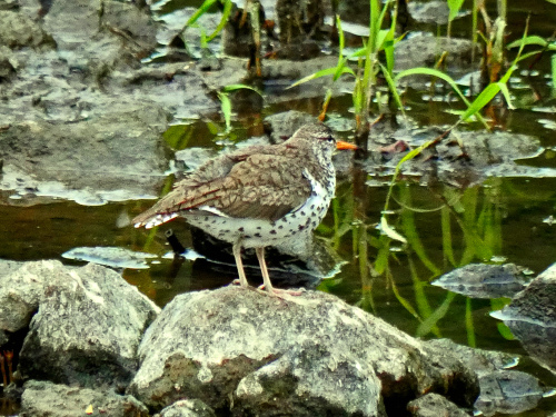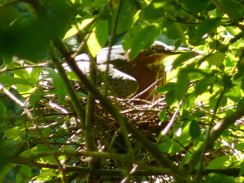 I had three Spotted Sandpipers at the retention pond near the new paved area, and we had one fly upriver past the rowing club and then back down. Mark spotted a Bullock's Oriole at the last minute from the rowing club. Of especial note were two Green Herons that flew into the rowing club pond, and then flew to the small pond. We cautiously investigated and I saw a new nest in the same tree where last years was, and there was one bird at it.